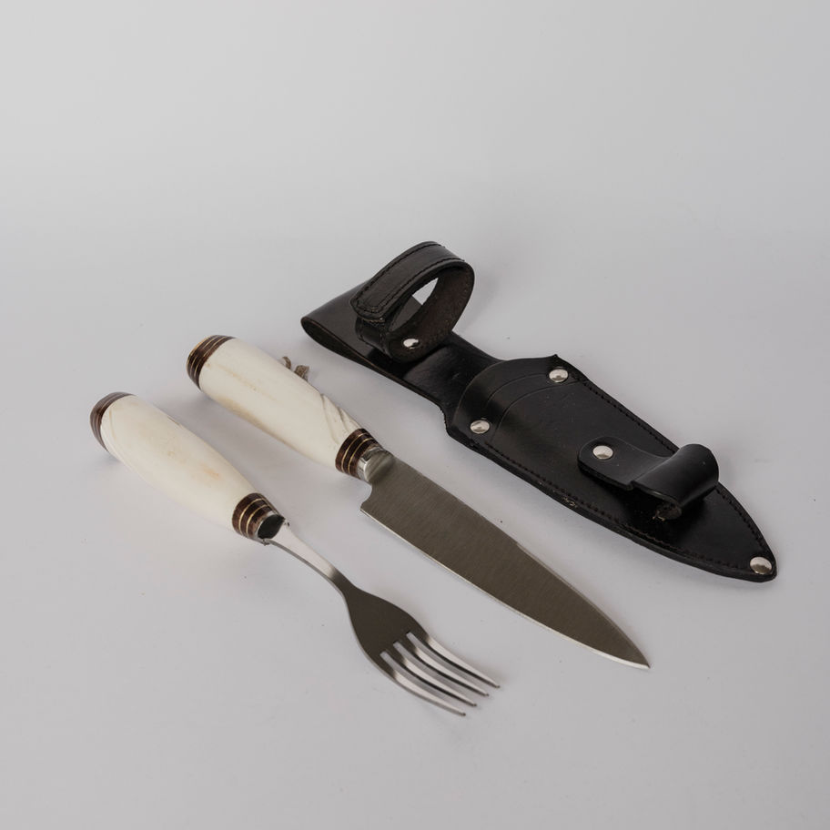 Cuchillo y tenedor individual elaborado artesanalmente en hueso de vaca seleccionado, con detalles y terminaciones en bronce. Con hoja en 14 cm de acero inoxidable 420 y vaina de cuero vaqueta hecha a mano.